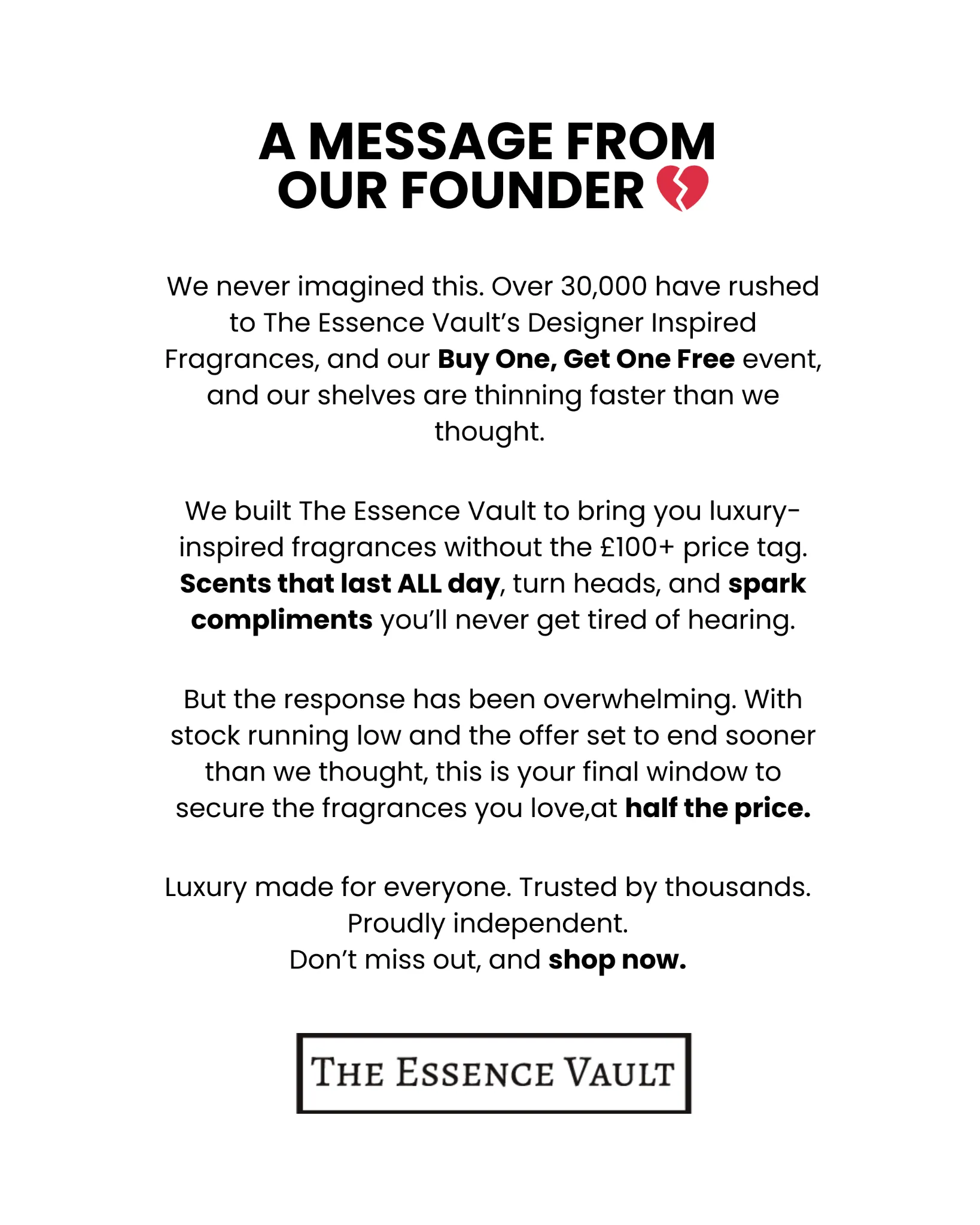 Looking for long lasting perfumes but tired of breaking the bank account? Today you're in luck! Switch to The Essence Vault for designer inspired scents, that last for longer and don't break your bank account. ✅ Made in the UK ✅ Cruelty friendly ✅ Designer Inspired Scents ✅ 4.7/5 Reviews ✅ Lasts all day and night ✅ Only 0.5% of people use our 100% money back guarantee!