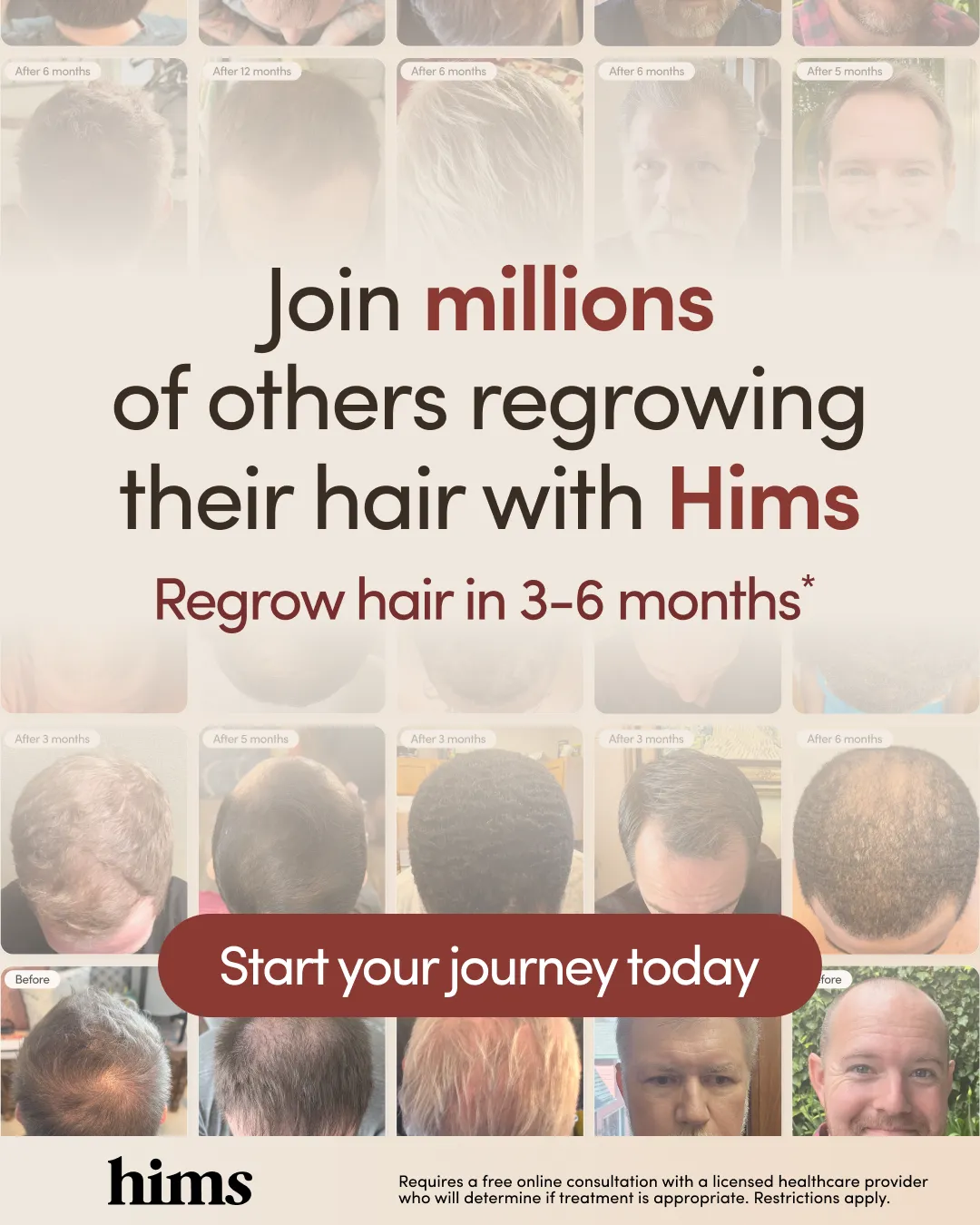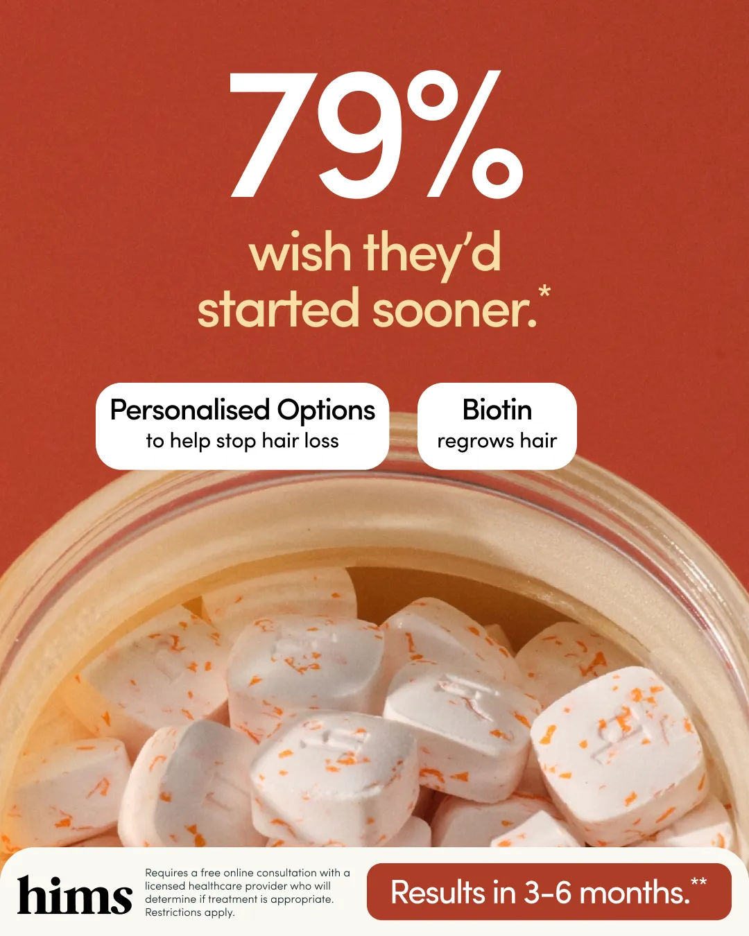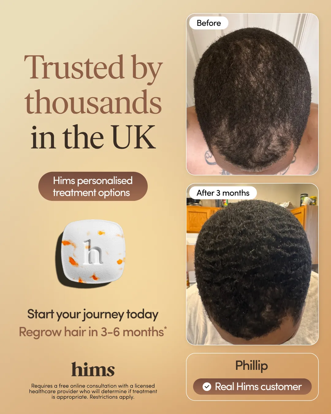 Win the Battle Against Hair Loss 💪 Choosing the right treatment doesn’t have to be overwhelming. We make it simple—with clinically proven solutions designed just for men. Why choose Hims? ✔️ Visible regrowth in 3–6 months ✔️ Trusted by over 1 million men ✔️ Rated 4.5/5 on average ✔️ Fully online, discreet delivery to your letterbox Take control. Start your journey today.