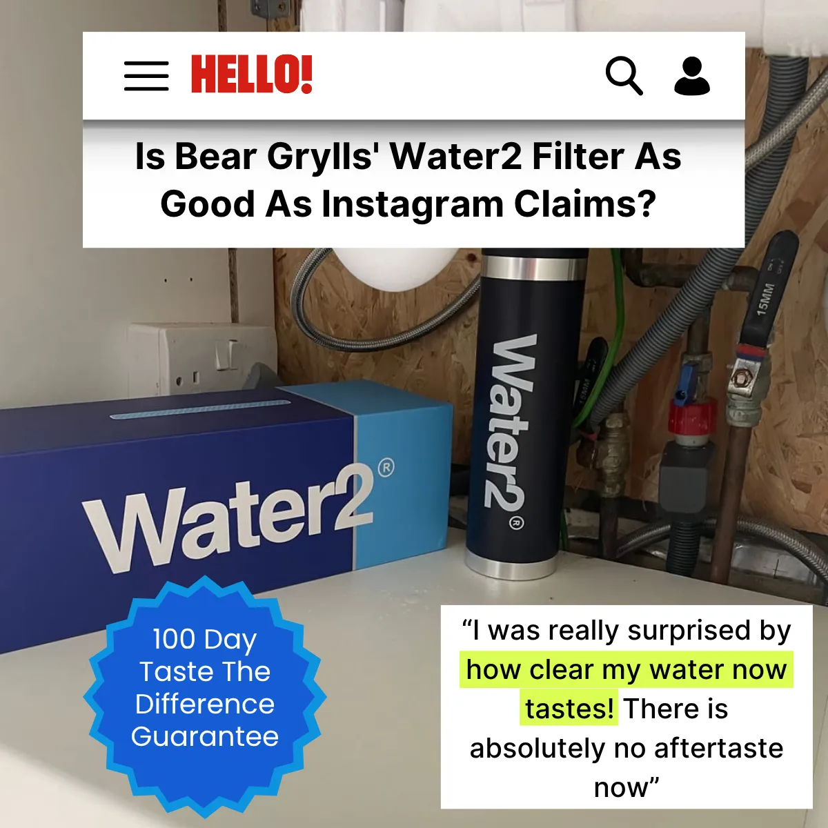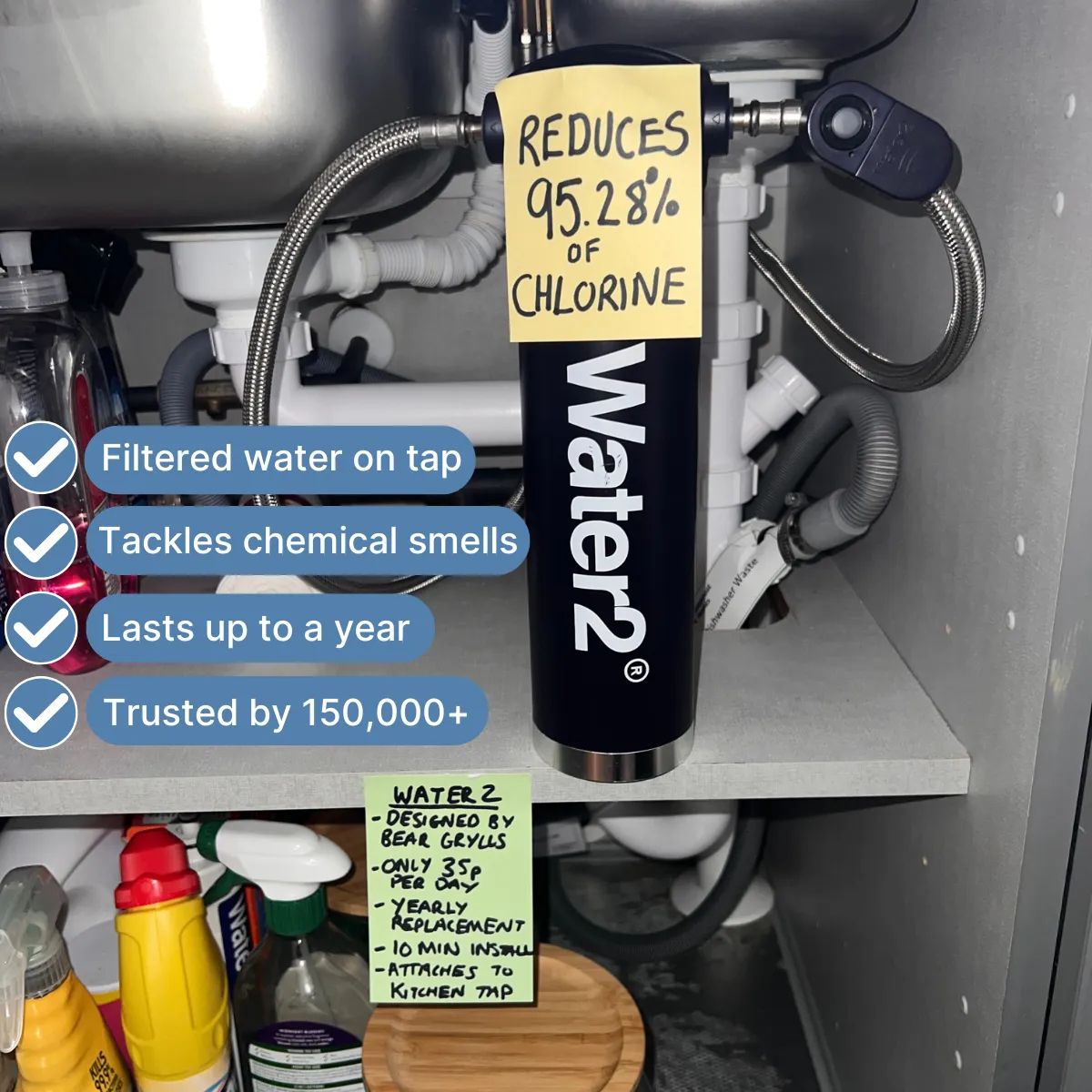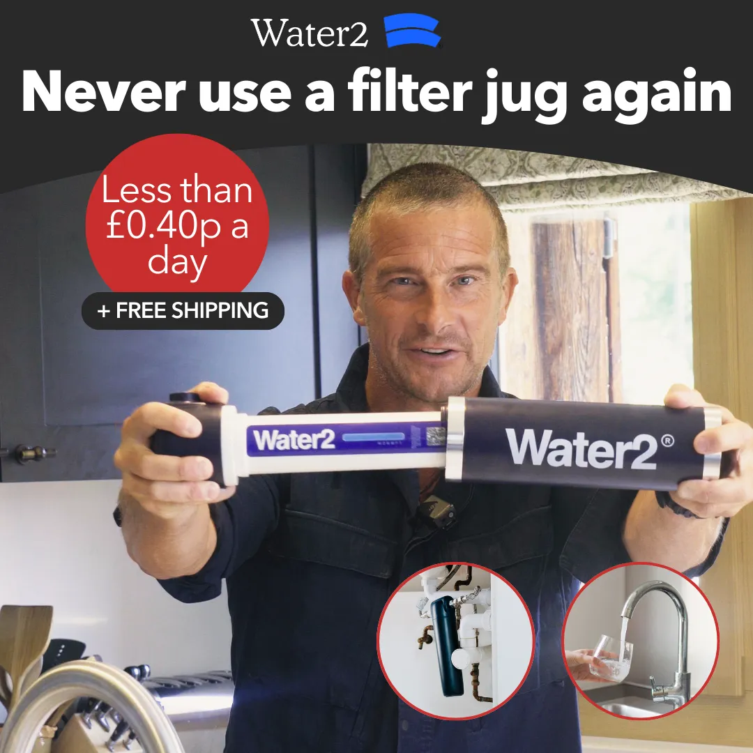 3 reasons to try Water2 💧 ✅ The best tasting water (guaranteed) 🧬 Tackles chemical or metallic smells 🚰 Filtered water straight from the tap Join over 100,000 homes who now have a Water2 **Bear Grylls is now a proud owner and investor in Water2!*