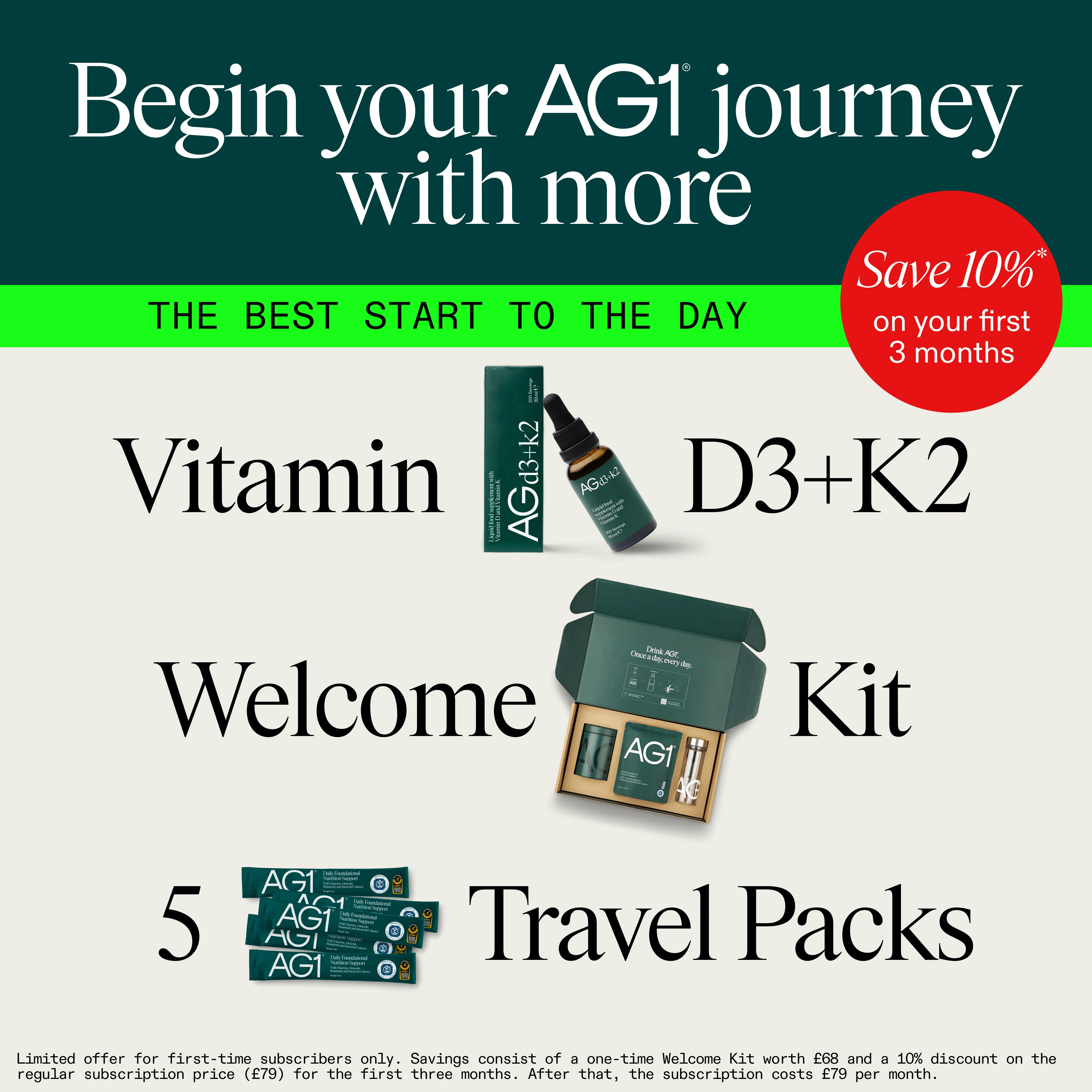 Start your AG1 routine today and youβll get 10% off your first three months, plus: π AG1 Monthly Pouch π 5 Free Travel Packs π Vitamin D3+K2 Drops π Convenient AG1 Shaker including measuring spoon and stainless steel container Commit to your health this month and save while doing so. -- *Offer valid for new subscribers only. For more information about our health claims, please visit our website.
