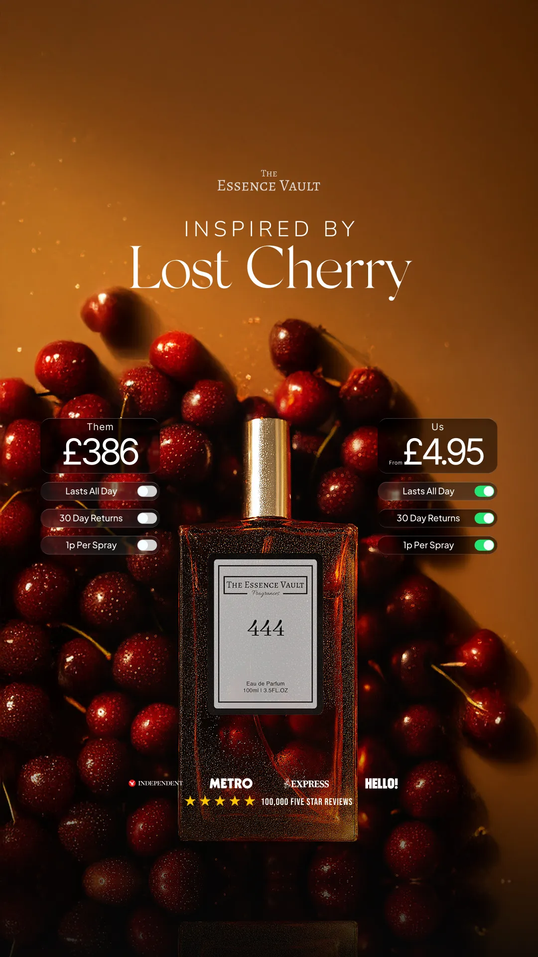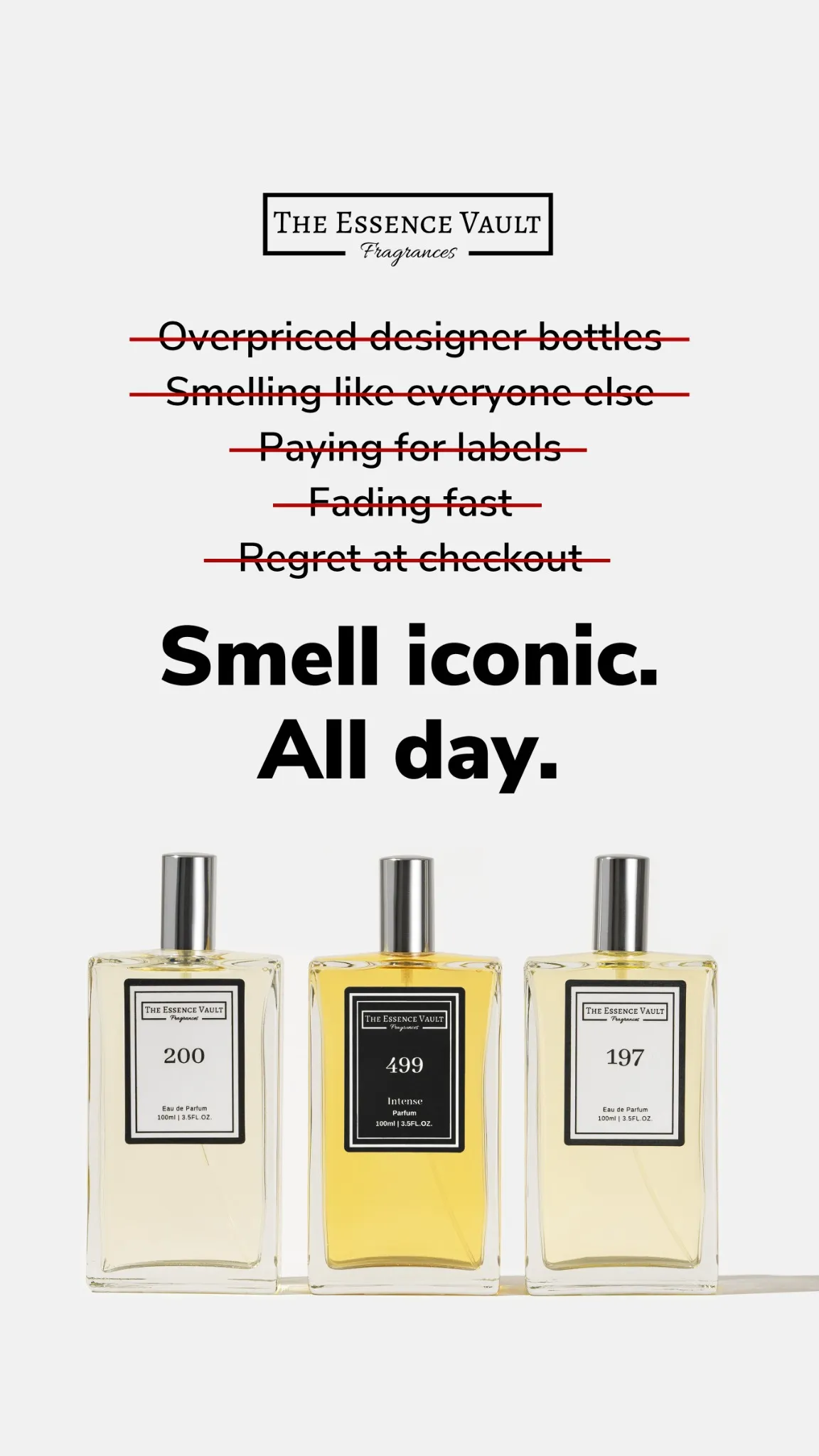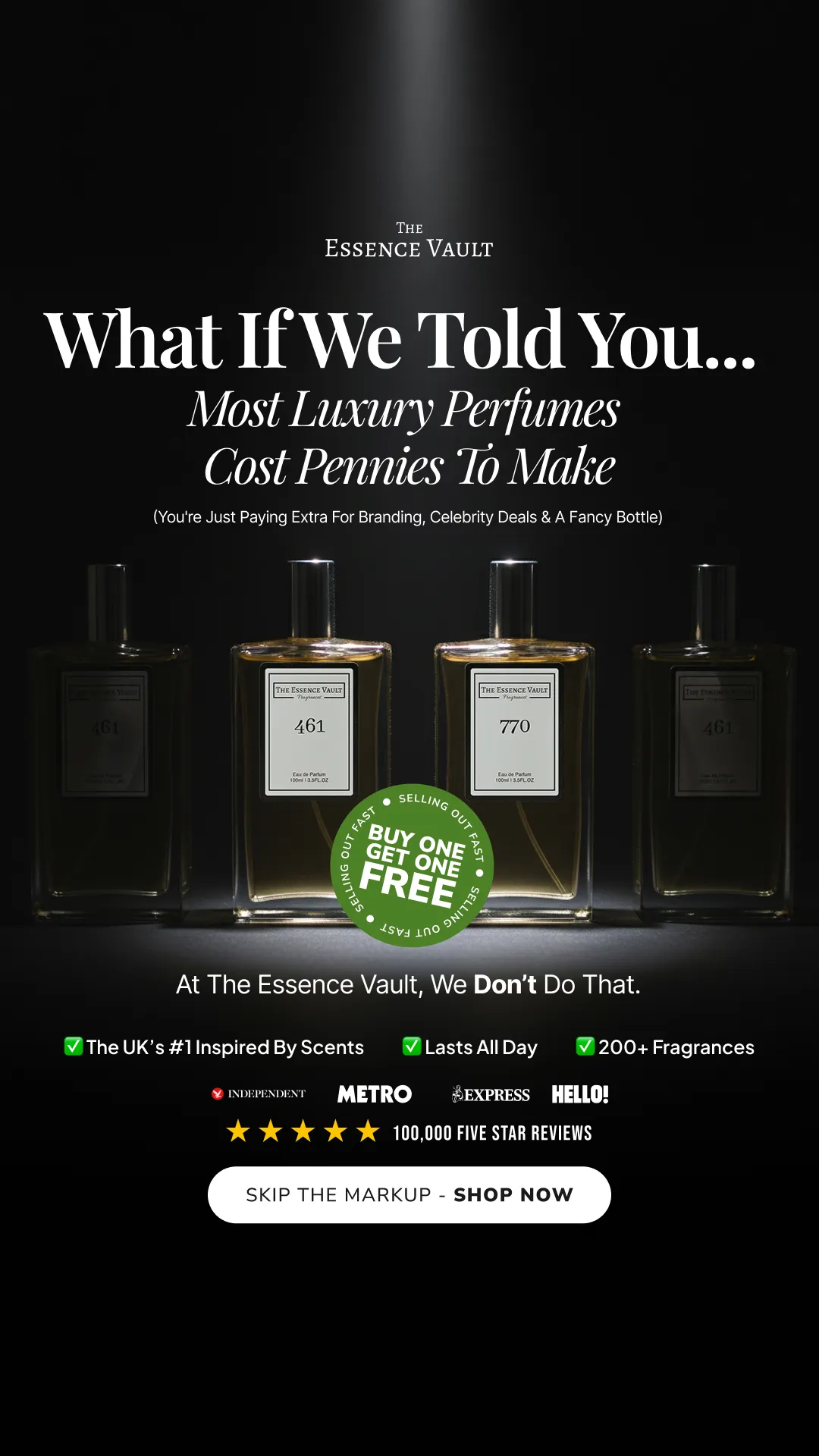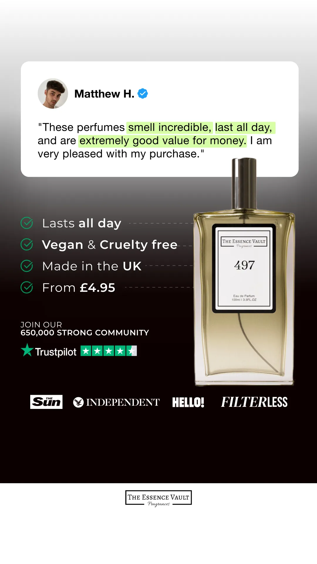 Looking for long lasting perfumes but tired of breaking the bank account? Today you're in luck! Switch to The Essence Vault for designer inspired scents, that last for longer and don't break your bank account. ✅ Made in the UK ✅ Cruelty friendly ✅ Designer Inspired Scents ✅ 4.7/5 Reviews ✅ Lasts all day and night ✅ Only 0.5% of people use our 100% money back guarantee!